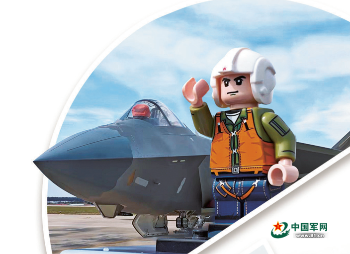 观众将飞行员造型的积木人与歼-20合影。陈学杰摄