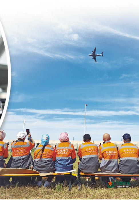 一群环卫工人正在观看飞行展示。唐家杰摄