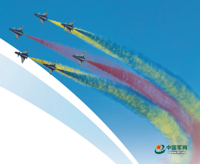 空军八一飞行表演队以菱形队形上升转弯。解放军报记者 许 东摄