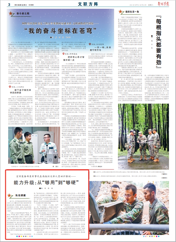 前不久,空军装备部某军事代表局文职人员王馨怡向专家汇报某项目质量监督成果,条理清晰、表达流畅,与1年前表现大不相同。她说,经过局里组织的文职人员回炉强训,自己能力有较大提升。
