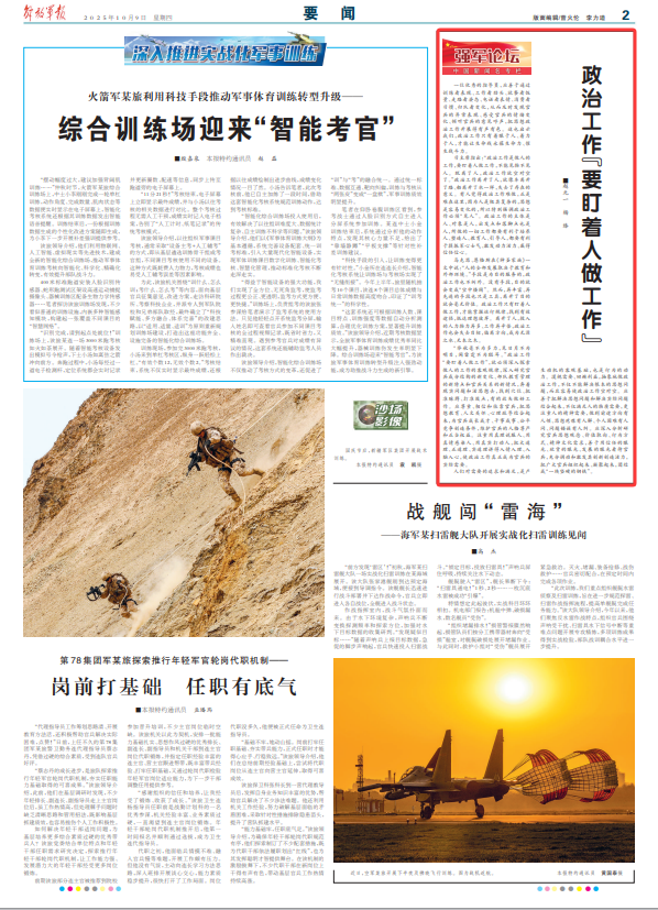 一位优秀的指导员,应善于通过训练看表现、工作看劲头、就餐看饭量、走路看姿态、电话看表情、消费看习惯、归队看变化,从而及时发现官兵的异常表现、感受官兵的情绪变化、倾听官兵的意见呼声,把思想政治工作开展得有声有色。这也启示我们,政治工作只有着眼于人、着力于人,才能让生命线永葆生命力、催生战斗力。