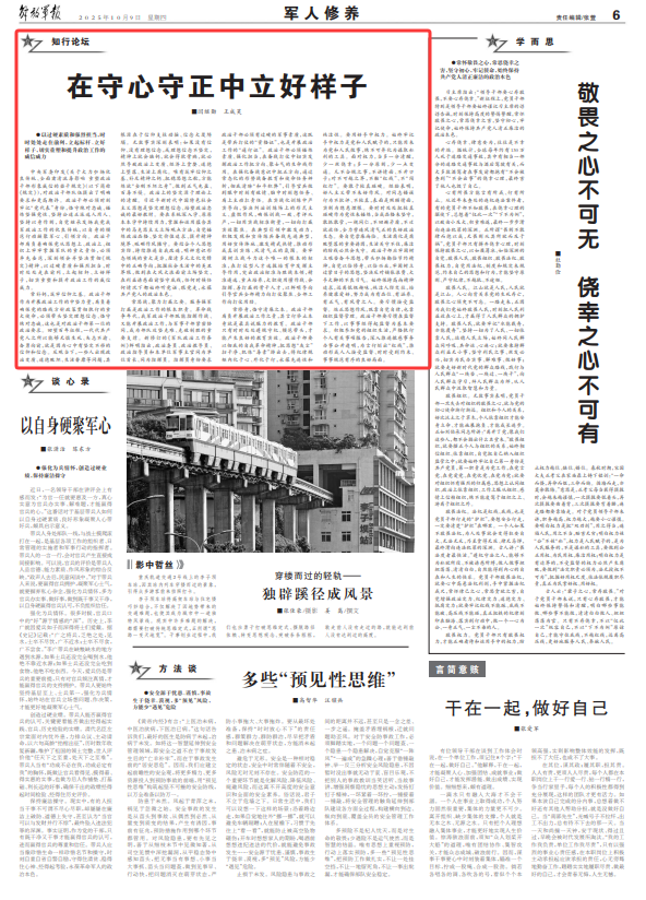 常修身,恪守清廉之本。政治干部肩负开展政治工作之责,其言行举止本身就是最具说服力的教育。政治干部只有时时处处遵规守纪、模范带头,才能产生良好的教育实效。政治干部要以彻底的自我革命精神,把思想“灰尘”扫干净、肌体“毒素”排出去,将纪律规矩内化于心、外化于行,永葆先进性和纯洁性。要用好手中权力。始终牢记手中权力是党和人民赋予的,只能用来为党和人民做事,绝不可异化为谋取私利的工具。面对权力,当多一分清醒,少一丝侥幸;多一分原则,少一点变通。凡不合规之事,不讲情面、不开口子;对不可越之界,不触“红线”、不“闯红灯”。要敢于较真碰硬。经验表明,好人主义带不来好作风。对同志错误行为不批评、不较真,表面是照顾情面,实则为隐患埋根。要时时处处把较真碰硬作为党性来锤炼,当成品格来坚守,敢抓敢管,一视同仁,不回避矛盾,不迁就放任,全力营造风清气正的良好政治生态。要自觉崇廉尚俭。生活腐化是腐败堕落的重要诱因,生活关守不住,廉洁的防线必然会失守。政治干部应牢固树立艰苦奋斗思想,带头弘扬勤俭节约精神,自觉以俭修身、以俭兴业,牢固树立过紧日子的思想,坚决反对铺张浪费、大手大脚的不良习气。始终保持高尚精神追求,远离低级趣味,纯洁人际交往,培养健康爱好,努力成为有品位、有涵养、有正气、有风骨之人。要习惯接受监督。端正思想作风,既靠自觉自律,也靠组织监督管理。政治干部要习惯在监督下工作,以事事经得起监督为基本要求。积极参加党的组织生活,严格执行个人有关事项报告,深入推进敏感事务办事公开透明,为言行划出“红线”,推动形成人人接受监督、时时受到约束、事事规范有序的良好局面。