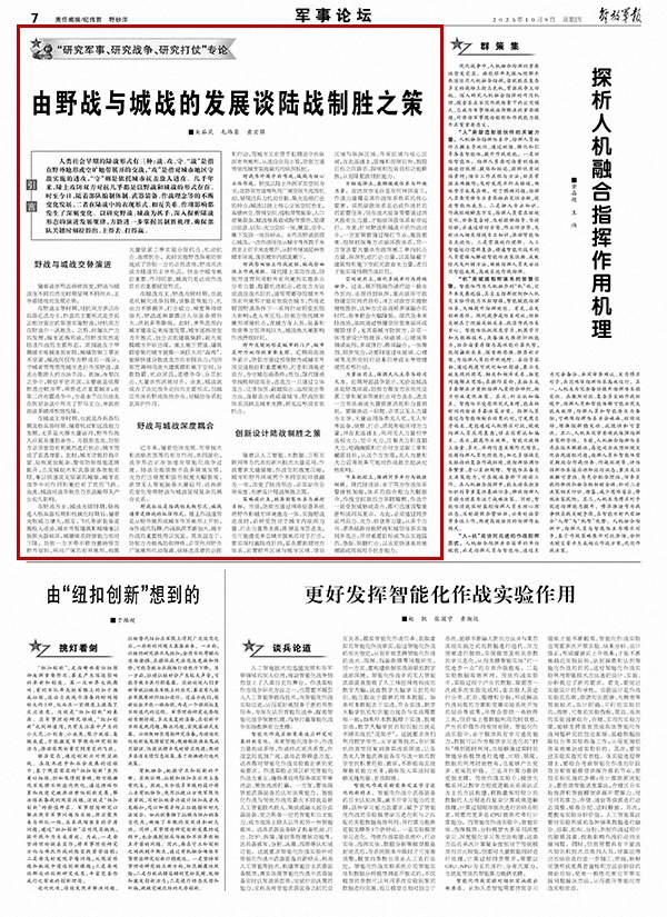 近年来,随着经济发展、军事技术和战略思想等的相互作用、共同演化,战争形态正在加速向智能化战争过渡。陆战全维侦察手段多领域发展,火力打击精度和毁伤程度大幅提高,新型无人智能装备大量运用,这些新的变化使得野战与城战呈现复杂的耦合关系。