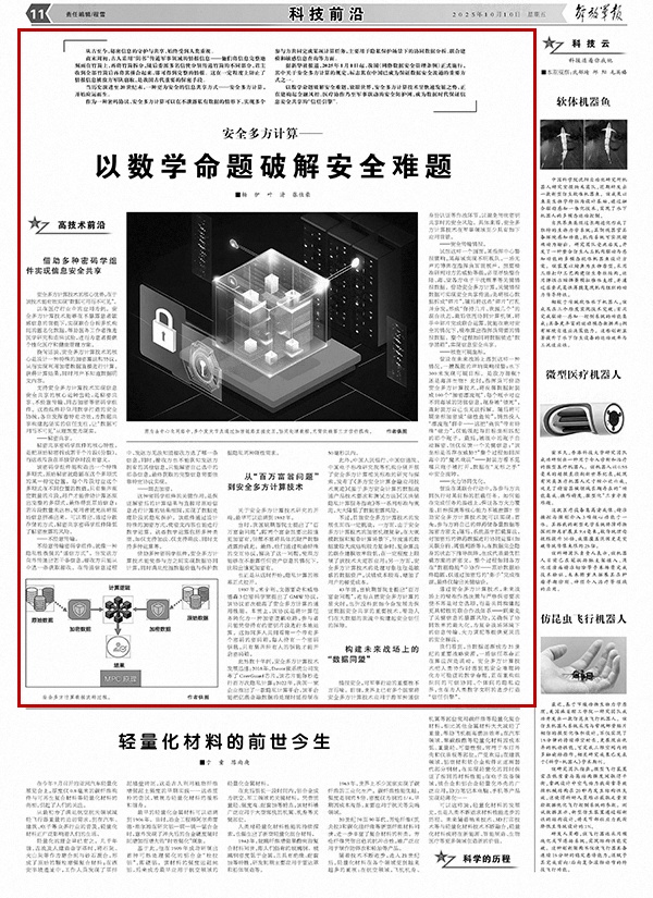 以数学命题破解安全难题,放眼世界,安全多方计算技术呈快速发展之势,正在建构起金融风控、医疗协作乃至军事联动的安全防护网,成为数据时代保证信息安全共享的“信任引擎”。