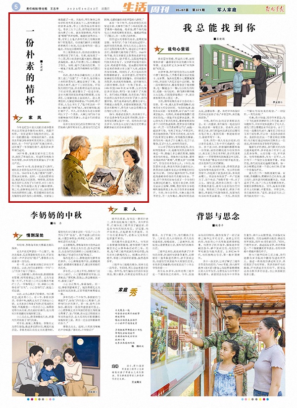 经历过生死考验的母亲,变得更加坚强。在我们几个孩子的成长过程中,她把对党的热爱、对他人的关心及在生活中克服困难的勇气,通过自己朴素的言行,潜移默化地传给了我们。1965年春节前,我父亲接到上级调他去新单位工作的命令。除夕那天,父母就带着我们坐火车出发了。父亲新单位是个部队仓库,有铁道专用线。官兵要经常将列车运来的物资从车上卸下入库,或装车再发往各地。时间久了,不少官兵的衣服都被磨破了。母亲知道后,经常把大家磨破的衣服拿回家缝补。有时破损的衣服多,母亲就彻夜缝补。这样解他人之困的事情,母亲一生做了很多。从1950年到1980年的30年里,父亲的岗位多次调动,我们一家也离开了大城市。我们对此不理解,母亲却说:“现在的条件比战争年代不知好了多少,你们要珍惜。你们是革命后代,要努力学习,向模范人物看齐,不要给家里抹黑。”在母亲的影响下,我们步入社会后都在各自岗位上努力工作着。