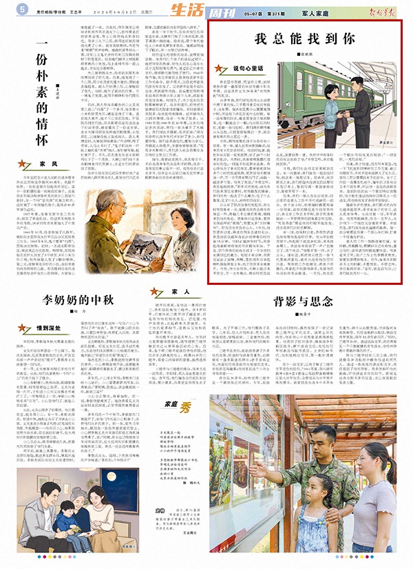 随着年岁的增长,我们聊天的内容也越来越简单,多半是孩子的学习、老人的身体等。生活日复一日,平平淡淡。他常常提醒我,作为一名军人,也许他下一个岗位又会离家千里。幸运的是,我们成为彼此温暖的港湾。每一次分别都是围着一个圆心在打转、盯着一个灯盏在折返。