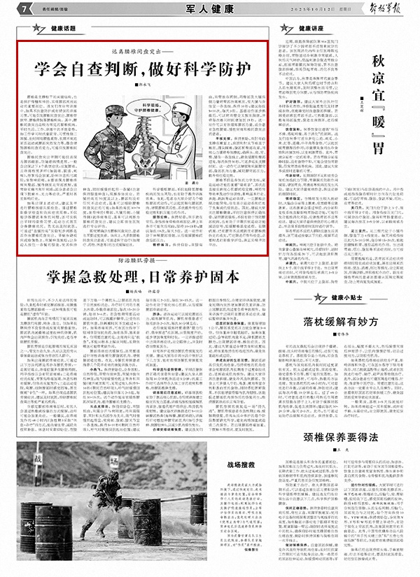 腰椎不仅是身体的力学支柱,更是运动功能的重要“晴雨表”,其状态直接反映核心肌群的稳定性、神经传导效率及动作协调性,影响基本行走、奔跑、跳跃等运动表现。一旦腰椎出现功能异常,往往表示运动系统已处于失衡或代偿状态。因此,建议大家关注腰椎健康,平时注意保持正确体姿、坚持腰部锻炼,不仅有助于预防腰部疾病,也有助于早期识别运动功能减退信号、延缓腰椎退变进程。长期伏案、已有腰背不适或既往有腰椎损伤史的战友,可定期进行骨科检查,必要时进行影像学评估,真正实现早防早治。