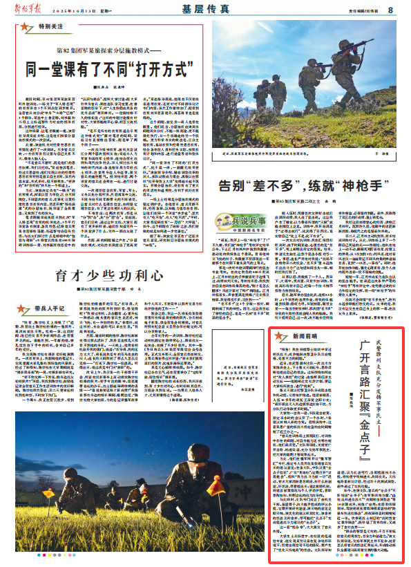 “官兵在训练场上摸爬滚打,对训练中存在的问题,对自身能力还有哪些短板,他们最清楚。”支队领导说,关键要广开言路,畅通渠道,充分发扬军事民主,把大家的聪明才智凝聚起来。