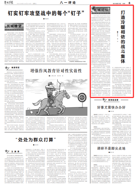 “战友战友亲如兄弟,革命把我们召唤在一起。”新征程上,带兵人要满怀对官兵的深厚感情做工作,培养甘苦与共、生死与共的革命情谊,巩固和发展团结、友爱、和谐、纯洁的内部关系,与官兵站在一起、想在一起、干在一起,在双向奔赴中实现思想共振、心灵共鸣、言行共融,打造冷暖相依的战斗集体。
