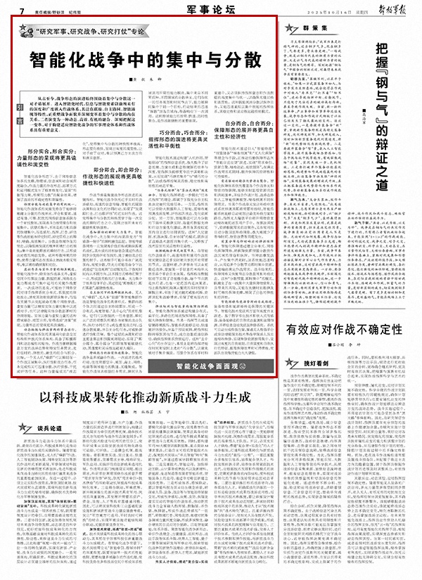 从古至今,战争形态的演进始终围绕着集中与分散这一对矛盾展开。进入智能化时代,信息与智能要素以前所未有的深度和广度嵌入作战体系,其泛在联接、自主协同、智能涌现等特性,正重塑战争面貌并深刻变革着集中与分散的内在关系,二者演变为一种动态、高效、有机的融合。深刻把握这一变革,对于构建适应智能化战争的军事理论体系和作战体系具有重要意义。
