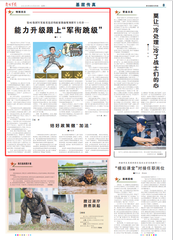 一项好政策如同种子,蕴含着丰收潜能,但能否硕果盈枝,关键在落实。第82集团军某旅某连的实践启示我们:唯有科学施策、主动作为,才能将政策红利转化为部队建设成效。