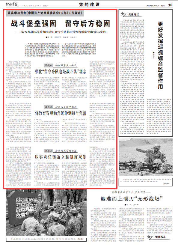 第74集团军某旅牢牢抓住临时党组织这个关键,注重从思想上引导官兵摒弃临时观念,进一步明确临时党组织的职能作用,以组织教育管理监督为纽带,用有温度的思想工作凝聚人心,靠全时动态管理消除盲区,让留守岗位成为练兵强能的平台,实现了“后方”与“前线”的同频共进,为部队驻训提供了坚强后盾。