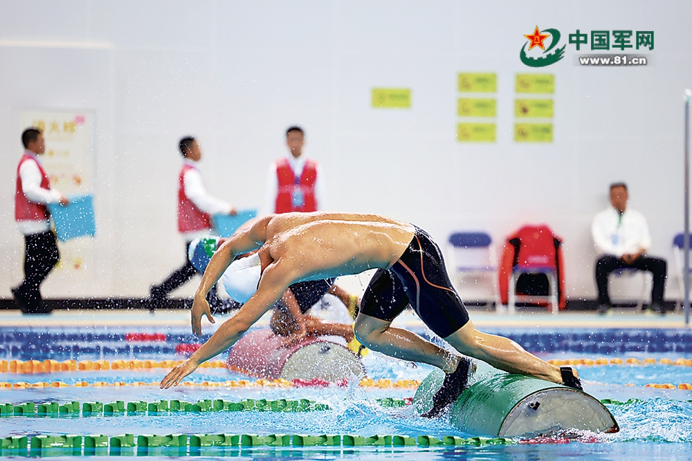 10月20日,选手在实用游泳比赛中翻越障碍桶。解放军报特约记者 张佳豪摄