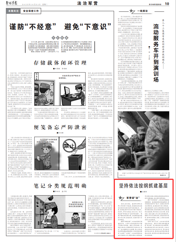 法者,治之端也。基层作为部队全部工作和战斗力基础,其建设成效直接关系到军队履行使命任务的能力。当前,有的基层单位仍旧习惯于经验式、运动式、命令式抓建,长此以往,“纸上的法律”终难成为“行动中的准则”。唯有严格依法依规行事,才能确保基层建设方向正确、推进有序,为提升战斗力筑牢根基。