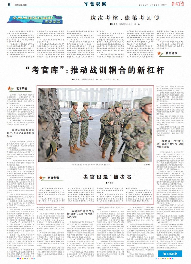 从临时委派到具备资质上岗,从经验评判到标准执尺,专业化考官亮相练兵场。这种将考核标准化作为评估战斗力成效的实践探索,正推动着训练理念的革新。