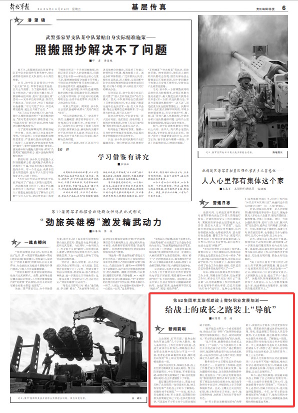 该旅人力资源科科长对此感触颇深:“人才培养不可能一蹴而就,唯有以科学合理的规划为指引,明确成长路径、搭建成长阶梯,方能充分激发人才潜能,让官兵各展所长。”