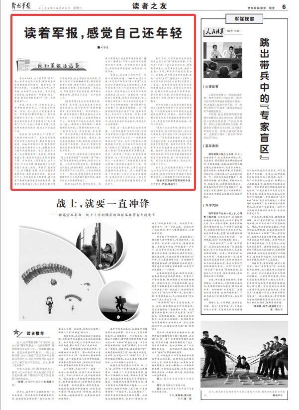 《解放军报》是中央军委机关报,是喉舌、是号角,也是基层官兵身边的良师益友,被大家视为“思想的辅导员、学习的好帮手”。和许多战友一样,我读军报的习惯是在部队生活中养成的,一天不看报,心里就觉得缺点什么。读军报可不能走马观花,要读出门道:一要看到上面的精神,二要看到部队的实践,三要看到战友的示范,才能学有方向、学有创新、学有榜样。每次在军报上看到好做法,我都会推荐给部队学习借鉴。离休后,我还养成剪报的习惯,遇到感兴趣的内容会剪下来留存。我认为,军报记录着我军的发展历程,剪报就是收藏军队的历史。