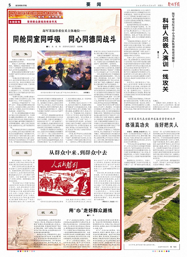 翻开我军历史,革命战争年代,我们正是靠着官兵吃穿不分家、打仗冲锋“跟我上”等体现官兵平等的做法获得了军队的壮大和战争的胜利。和平建设时期,作为政治干部,树牢群众观点,用“心”走好群众路线,方能让“生命线”更具生命力。