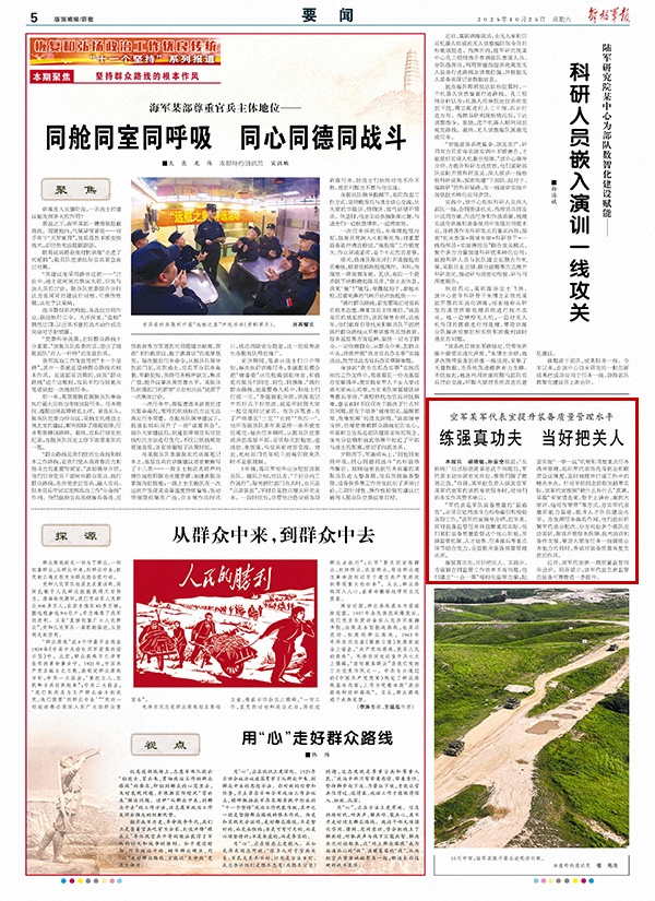“军代表是军队装备质量的‘监造官’,必须自觉用战斗力标准牵引和检验各项工作。”该军代室领导介绍,近年来,面对装备监管任务日益繁重的实际,他们紧盯装备质量监督这个核心职能,围绕监管机制、人才培养、任务练兵等重点环节综合发力,全面提升装备质量管理水平。