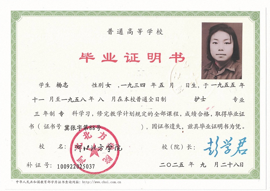 一次偶然的机会,滕玉平得知可以补办毕业证明书的消息。在多方帮忙下,她找到并拨通了原张家口医士学校、现河北北方学院档案馆的电话。