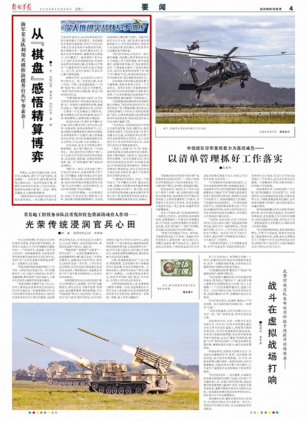 “随着战争形态加速向信息化智能化战争演变,一体化联合作战已成为基本作战形式,这对各级指挥员的综合素质提出了更高要求。兵棋推演具有很强的逼真度,有利于引导官兵在贴近实战的环境中培塑战场思维、提升谋略水平。”该支队领导介绍,为提升官兵军事素养、练强指挥决策能力,他们遴选了一批训练骨干和专业人才,集中组织兵棋推演培训,积极参加各类兵棋推演比赛,在棋盘上的“厮杀”中锤炼协同作战和应急应变能力。近几年,该支队兵棋小队多次在比赛中取得佳绩。