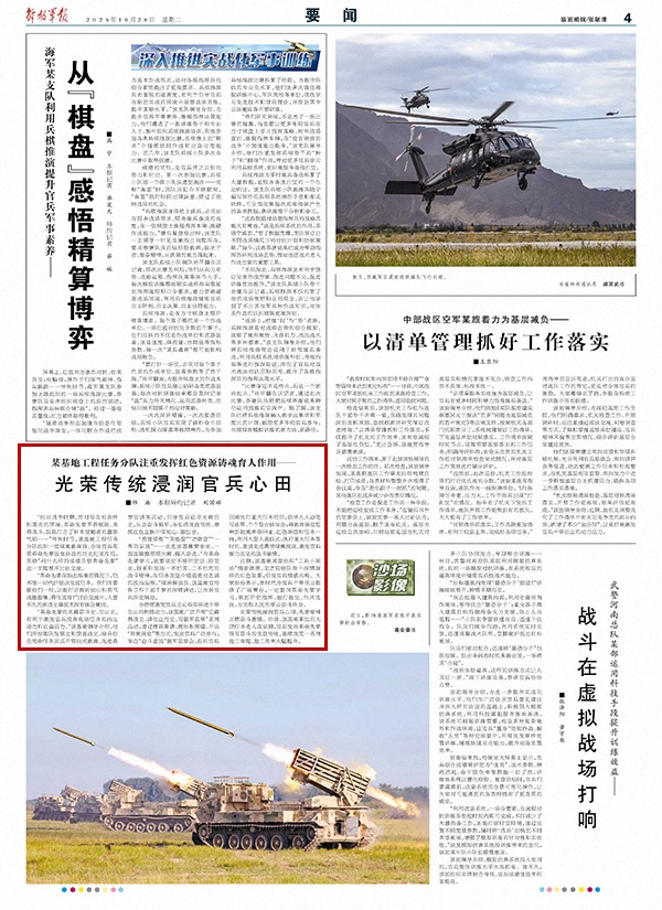 光荣传统浸润官兵心田,先辈精神点燃奋斗激情。日前,该基地承担的大项任务进入攻坚期,官兵发扬革命先辈艰苦奋斗的优良传统,连续攻克一系列施工难题,施工效率大幅提升。
