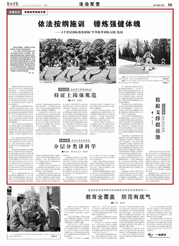 今年,新版《军事体育训练大纲》(以下简称“新大纲”)正式施行。新大纲聚焦备战打仗需求,紧贴部队实际,坚持从难从严从实战需要出发,重塑我军军事体育训练内容和标准体系,着力提升科学化专业化实战化水平,是各级组织实施军事体育训练的基本依据。贯彻落实新大纲要求,各部队要认真学习、深入剖析和对照落实,不断改进工作方式方法,确保依法组训按纲施训,不断提升军事体育训练效能。