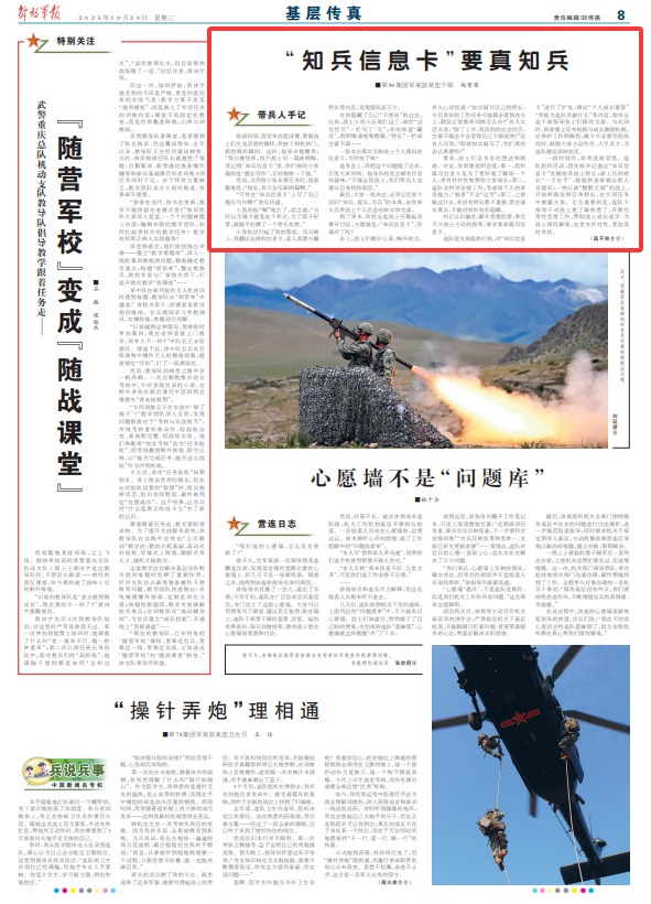 前段时间,营里举办篮球赛,看着战士们生龙活虎的模样,我按下相机快门,抓拍精彩瞬间。这时,指导员提醒我:“等比赛结束,找个战士写一篇新闻稿。我记得‘知兵信息卡’里,你们排的小张填的是‘擅长写作’,正好锻炼一下他。”