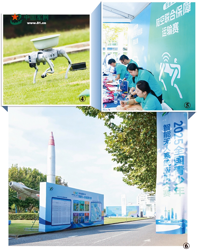 图④:参赛选手在比赛中操控智能无人设备,完成指定任务。图⑤:赛前,志愿者引导参赛选手签到。图⑥:东方绿舟国防园一角。
