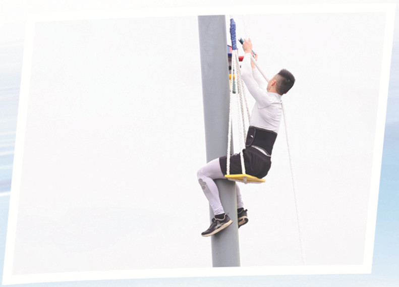 海军五项的航海技术比赛,在木兰湖中进行。比赛内容极具实战性,凸显水兵特色,考验的都是海军的看家本领——桅杆作业模拟的是舰艇高空作业、设备维护、瞭望和信号旗悬挂等甲板作业,要求官兵在高海况下,仍然能够快速精准操作。