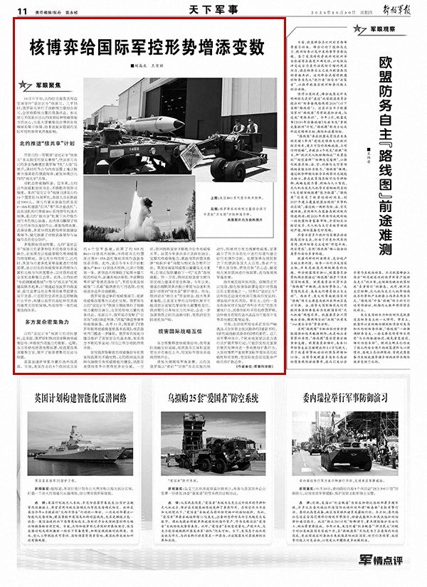 10月中下旬,北约位北海及其周边空域举行“坚定正午”核演习。几乎同时,俄罗斯也举行了战略核力量综合演习,全面检验核力量的战备状态。相关演习不仅显示出北约国家延伸核威慑能力的决心,也是大国地缘政治博弈在核领域的集中体现,给本就复杂脆弱的国际军控形势带来消极影响。