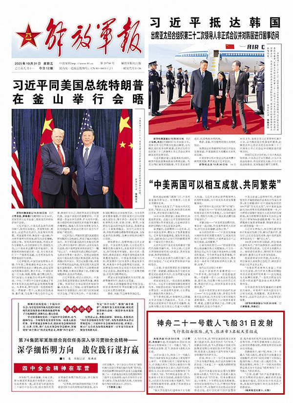 解放军报酒泉10月30日电 记者李岩、朱柏妍报道:我国瞄准10月31日23时44分发射神舟二十一号载人飞船,飞行乘组由张陆、武飞、张洪章3名航天员组成。