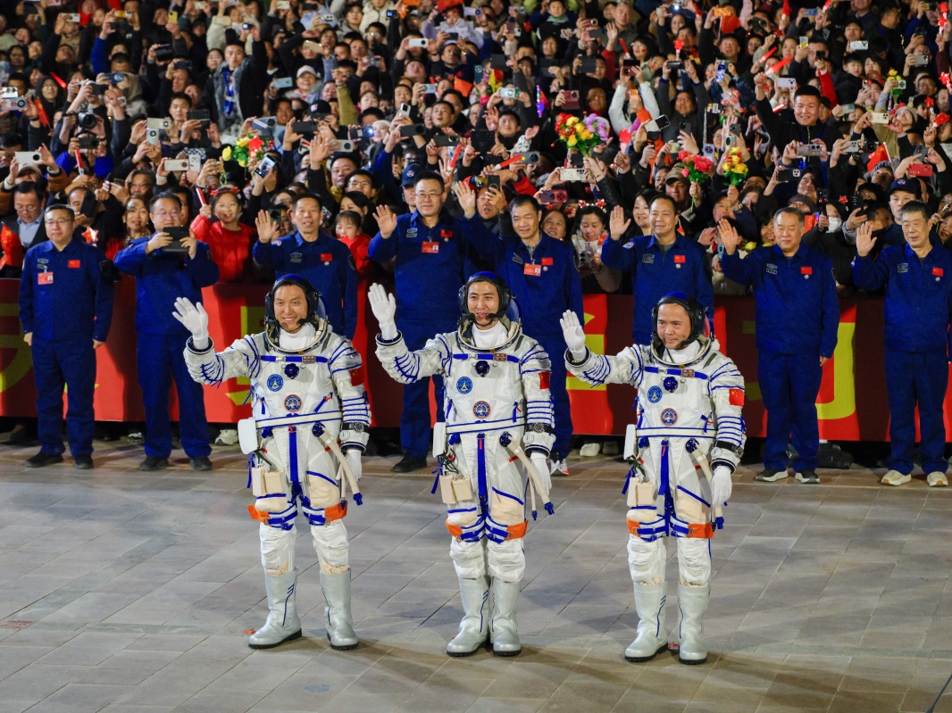 “出发!”随着出征命令下达,3名航天员挥别人潮花海,踏歌出征。