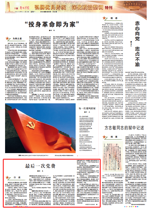 打开手绢后,里面有两张用旧了的中央革命根据地的钞票和1块银圆,还有一张小纸条,上面有两行模糊的铅笔字:“如果我牺牲了,这是我的最后一次党费。”