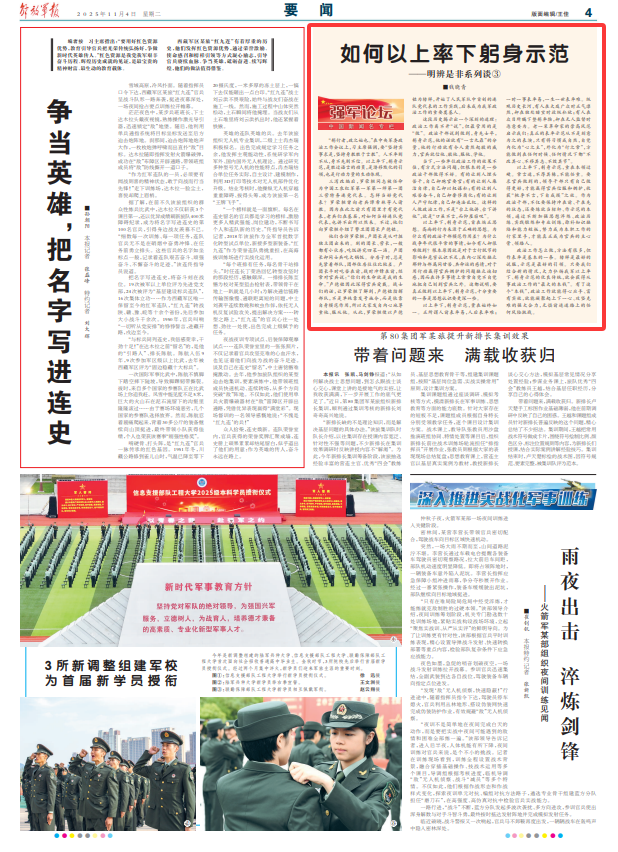 “躬行者,政之始也。”在中央军委政治工作会议上,习主席强调,要“坚持实事求是,坚持身教胜于言教”。人不率则不从,身不先则不信。以上率下,躬身示范,是胜过语言的动员,是潜移默化的引领,也是行动力量的生动体现。