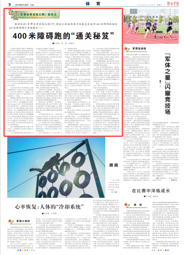 新颁发的《军事体育训练大纲》中,新设立的通用战斗体能包含通用400米障碍和组合400米障碍两个考核课目——