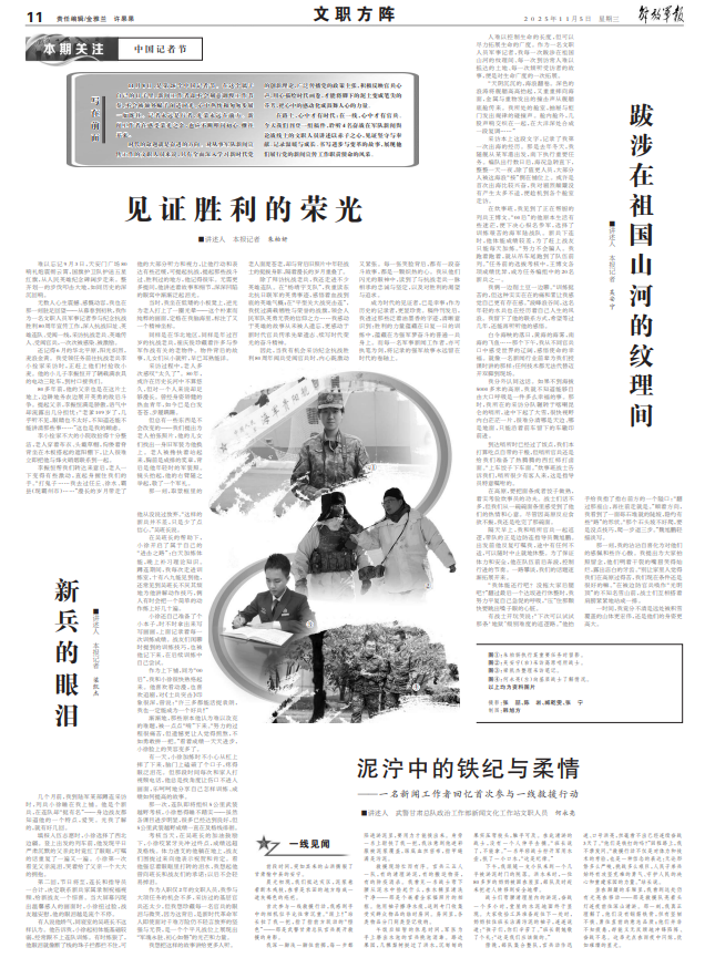 成为时代的见证者,已是幸事;作为历史的记录者,更显珍贵。稿件刊发后,我透过那些泛着油墨香的字迹,清晰意识到:胜利的力量蕴藏在日复一日的训练中,蕴藏在为强军梦奋斗的普通一兵身上。而每一名军事新闻工作者,亦可执笔为剑,将记录的强军故事永远留在时代的卷轴上。