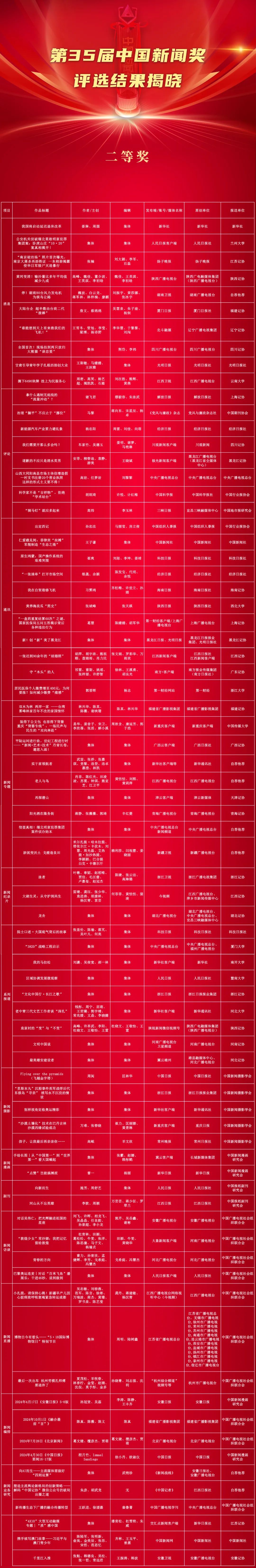 由中华全国新闻工作者协会主办的第35届中国新闻奖评选结果于11月5日揭晓。来自各级各类媒体的377件作品获中国新闻奖,其中,特别奖4件、一等奖74件、二等奖113件、三等奖186件。