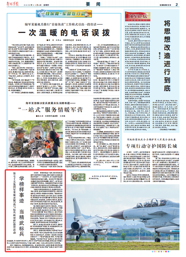 “邀请兄弟单位的精武标兵、先进典型来队分享奋斗故事,是我们破解教育资源不足、教育形式创新乏力等现实难题的有效举措。”该旅领导介绍,他们结合野外驻训、重大节日、新兵入伍等时机,探索推出“我与标兵面对面”教育活动,通过组织联合授课、事迹报告、战例研讨等形式,邀请友邻军兵种单位的优秀官兵来队,同忆红色传统、共学奋斗故事,推动思想政治教育走深走实。