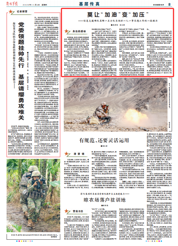 当天夜里,他反思感到,部队转型建设提速,对官兵能力提出更高要求。有些年轻战士渴望快速成长进步,但往往欲速不达,这种情况下,“加把劲”“你能行”之类的简单鼓劲,有时反而会增加压力。