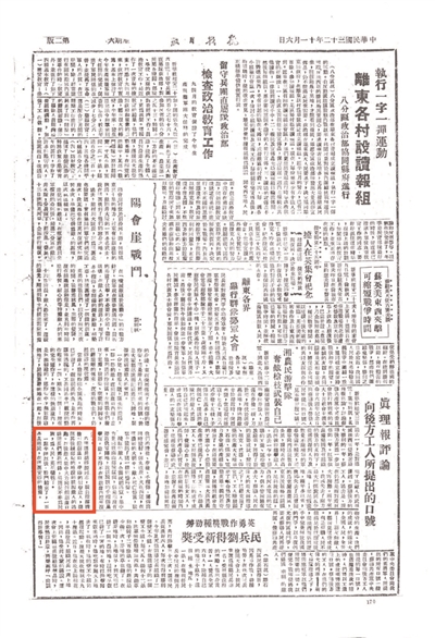1943年11月6日的《抗战日报》对阳会崖战斗进行了报道,并提到英勇作战的特务团六连连长胡俊源。受访者供图