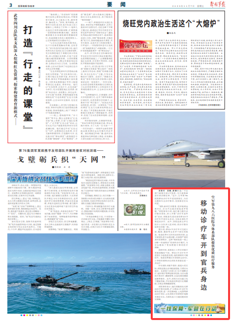 “部队演训任务繁重,驻训地域远离市区,官兵外出就诊面临诸多难题。”该院领导介绍,他们着力提升诊疗服务质效,深入开展“诊疗车进军营”活动,将配备先进设备的移动CT诊疗车开到官兵身边,为体系部队开展巡回诊疗。此外,该院还派出多支医疗小分队深入驻训场,将诊疗服务延伸至训练一线。