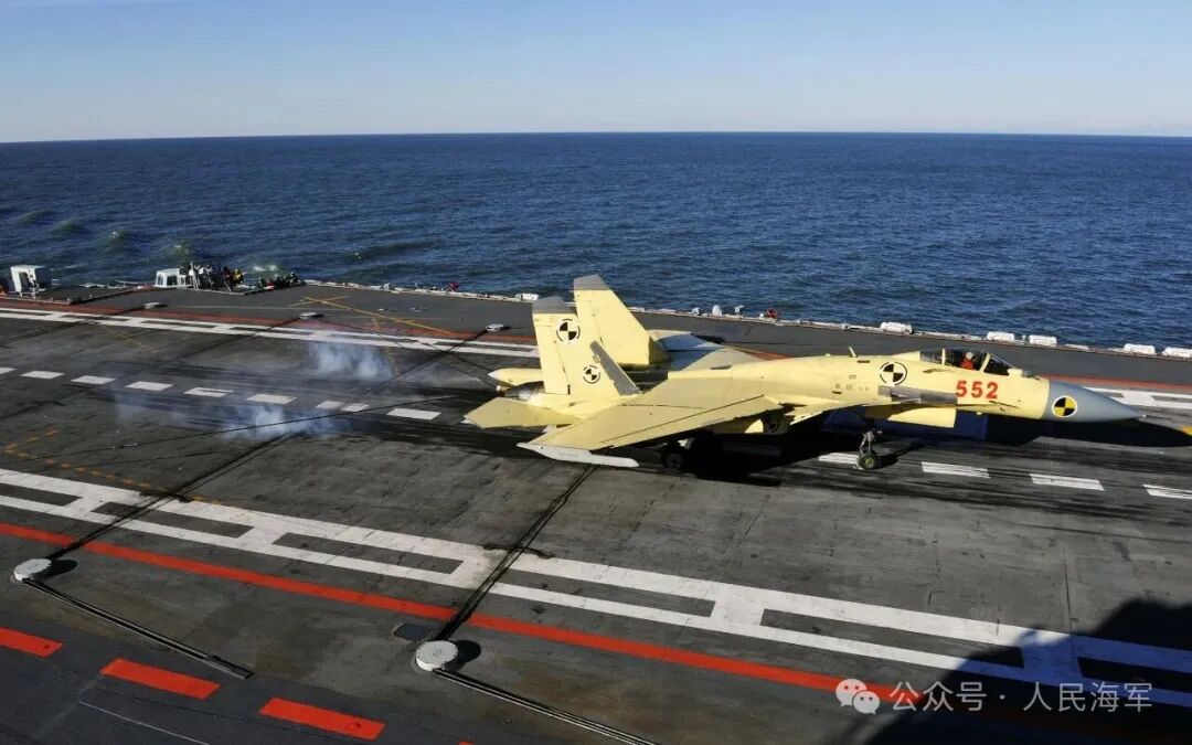 ▲歼-15舰载战斗机首次在辽宁舰成功着舰
