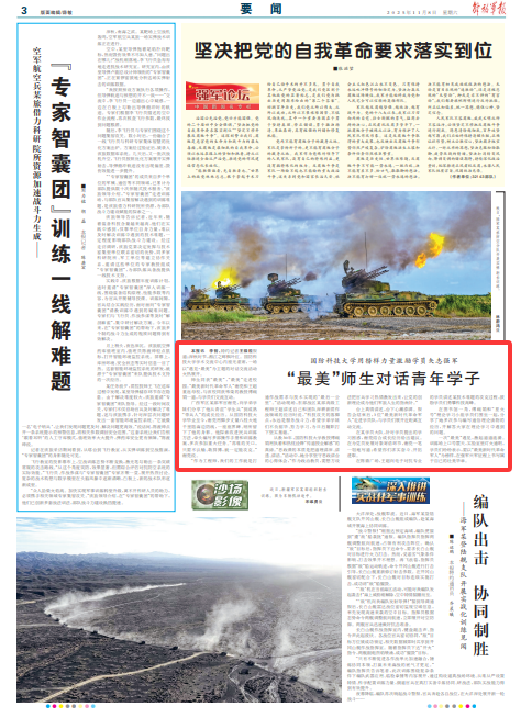 师生同获“最美”,“最美”走进校园。“最美新时代革命军人”谢亮和王超重返母校,与该校同获殊荣的教授傅婉娟一道,与学员们交流互动。