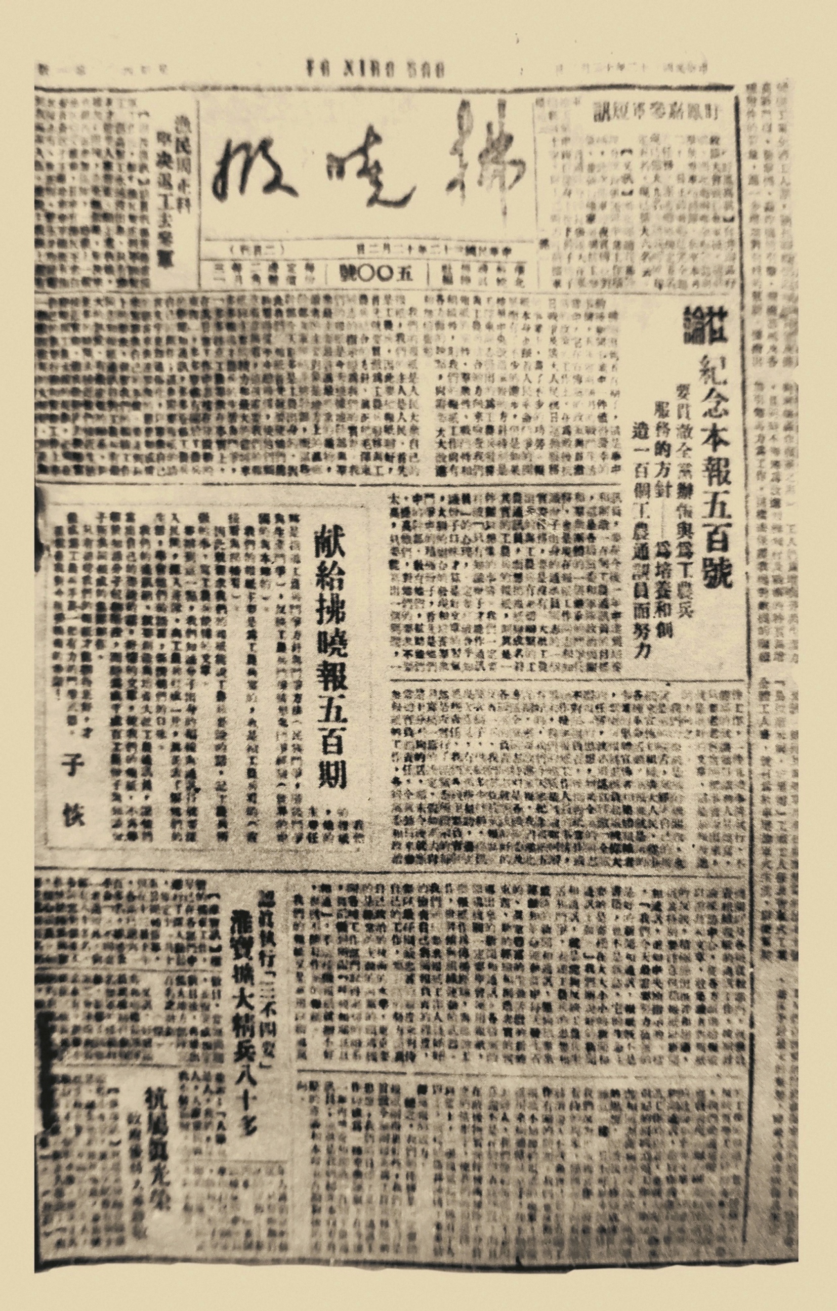 1943年12月2日,在《拂晓报》出版500期时,彭雪枫洋洋洒洒写了5000字的《贺拂晓报五百号——五年来拂晓报的检讨》,为《拂晓报》“祝寿”。文中,他将《拂晓报》“坚持5年零2个月的长期过程而不懈”,称为“在希望之中而又很出意料之外”的奇迹。为了写这篇文章,他把490多期《拂晓报》全部翻了一遍。