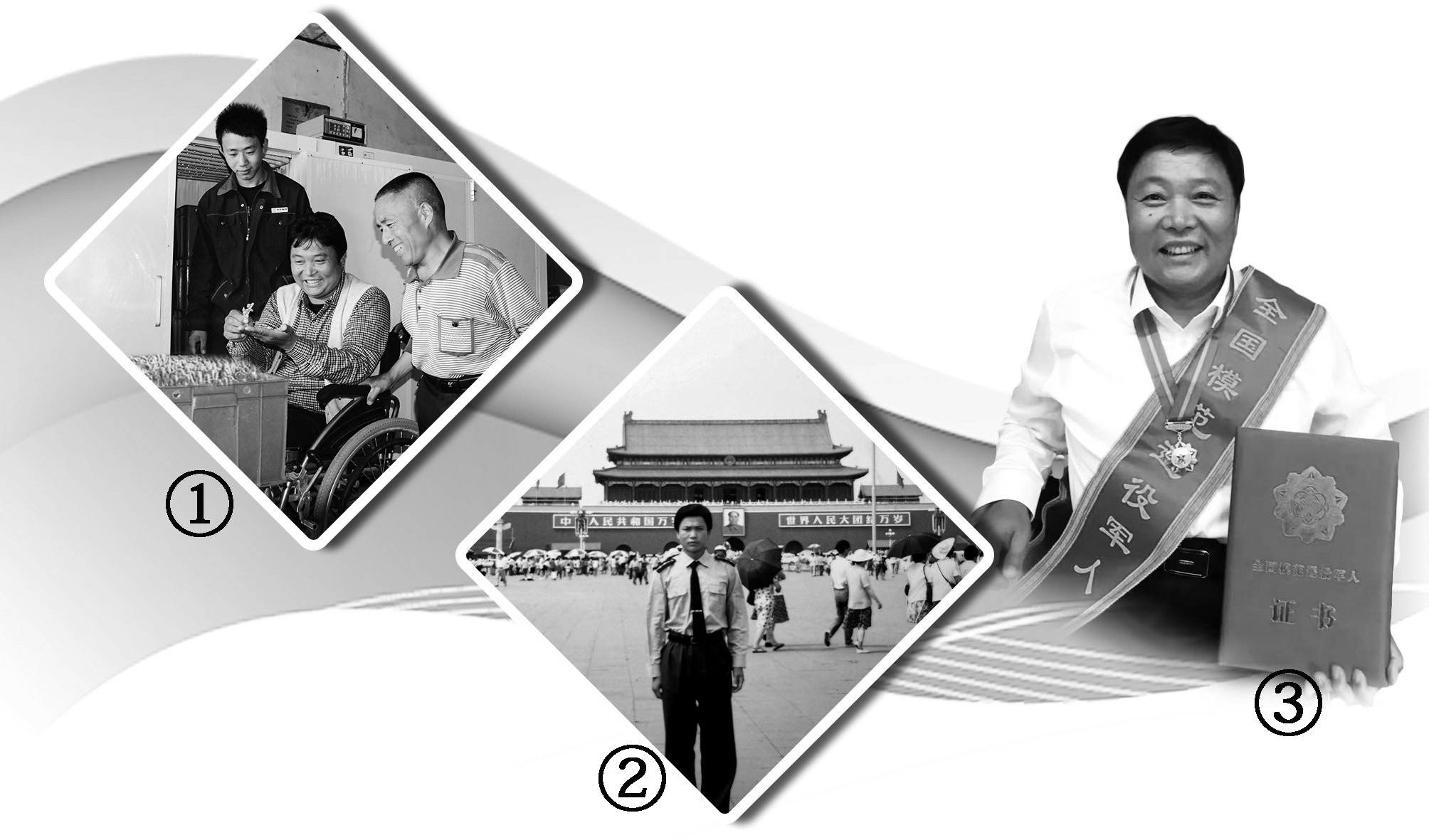 图①:孙继发(中)指导残疾人学习豆芽培育技术。王金龙摄 图②:孙继发1992年在天安门广场留影。受访者供图 图③:孙继发获评“全国模范退役军人”后留影。袁 林摄