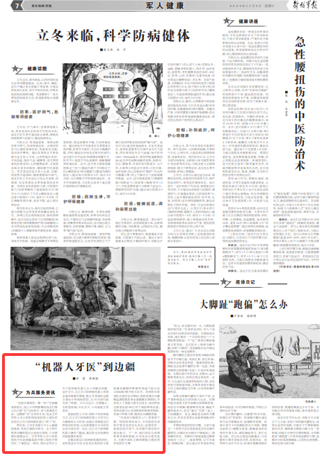 “这新牙跟真的一模一样!”在新疆某部营区,战士小刘咧着嘴向战友们展示自己刚“长”出的前牙,语气里满是兴奋。这颗新“长”出来的牙齿,是由空军军医大学口腔医院赵铱民院士团队研发的自主式口腔种植机器人“种下”的。