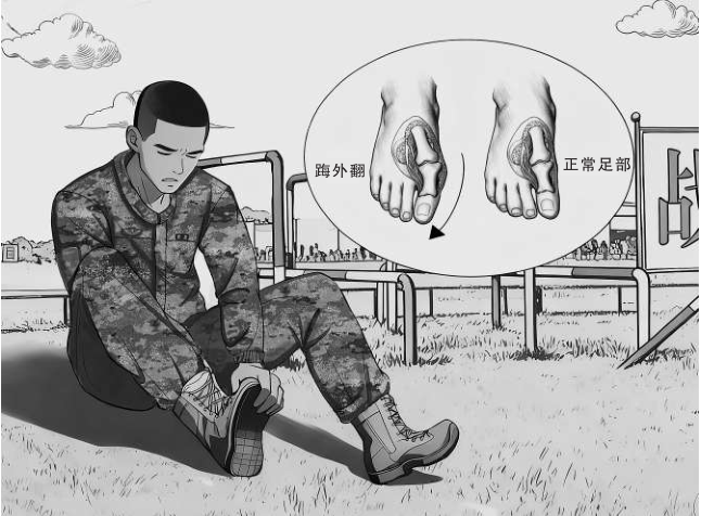 踇外翻的主要症状表现为踇趾的跖趾关节内侧凸起、表面红肿、按压疼痛,穿鞋后症状更加明显。随着病情发展,踇趾还会逐渐外翻挤压第二足趾,导致前脚掌出现胼胝(老茧),行走时疼痛加剧。长期负重行军的步兵、侦察兵,由于脚掌持续受压,较易出现足部变形。此外,天生扁平足或韧带松弛的人群,若经常进行高强度训练,为维持身体平衡会不自主地将踇趾往外推,从而导致踇外翻形成。