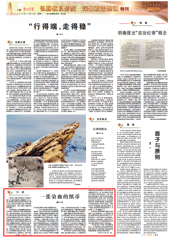 一天,第1纵队司令李谦把我找去。他拿出一张从白区带来的50元香港纸币对我说:“请你把这张港币换成现洋,作部队的伙食钱。”我接过一看,纸币上有血迹,这是他在隆安战斗中负伤沾上的。我心里一阵感动,一个纵队司令,在战斗中,身先士卒,不怕流血牺牲,不但没有报酬,反把自己染着血迹的钱拿出来,补贴部队的伙食钱,这是何等可敬的精神、高贵的品质啊!我犹豫不决起来,收不收这个钱呢?拿吧,不妥,不拿吧,伙食钱又的确一时难以解决。李司令看我进退两难的样子,性急地说:“怎么?拿去吧!”“李司令,你收回去吧。伙食钱我想办法去弄。”为了说服他,我又摆出理由说:“这里到哪儿去换钱呢?何况,上面还有血迹,别人不会要的。”