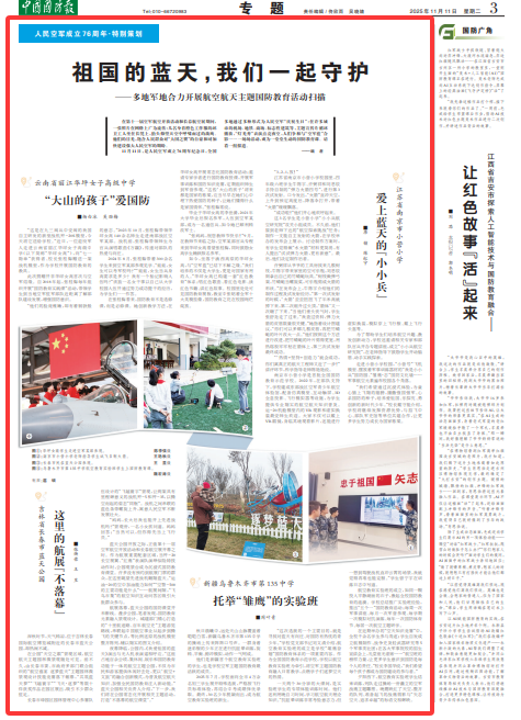 在近期举办的“空天知识竞赛”中,全校千余名学生参与角逐;学生自发成立航模制作、战争史及轻武器研究等5个军事类社团;在各大军事院校的招生宣讲会上,礼堂座无虚席……“航空班的榜样力量,让更多学生意识到国防是每个人的责任。”校长李国华说,“我们希望每个孩子都成为国防建设的参与者。”